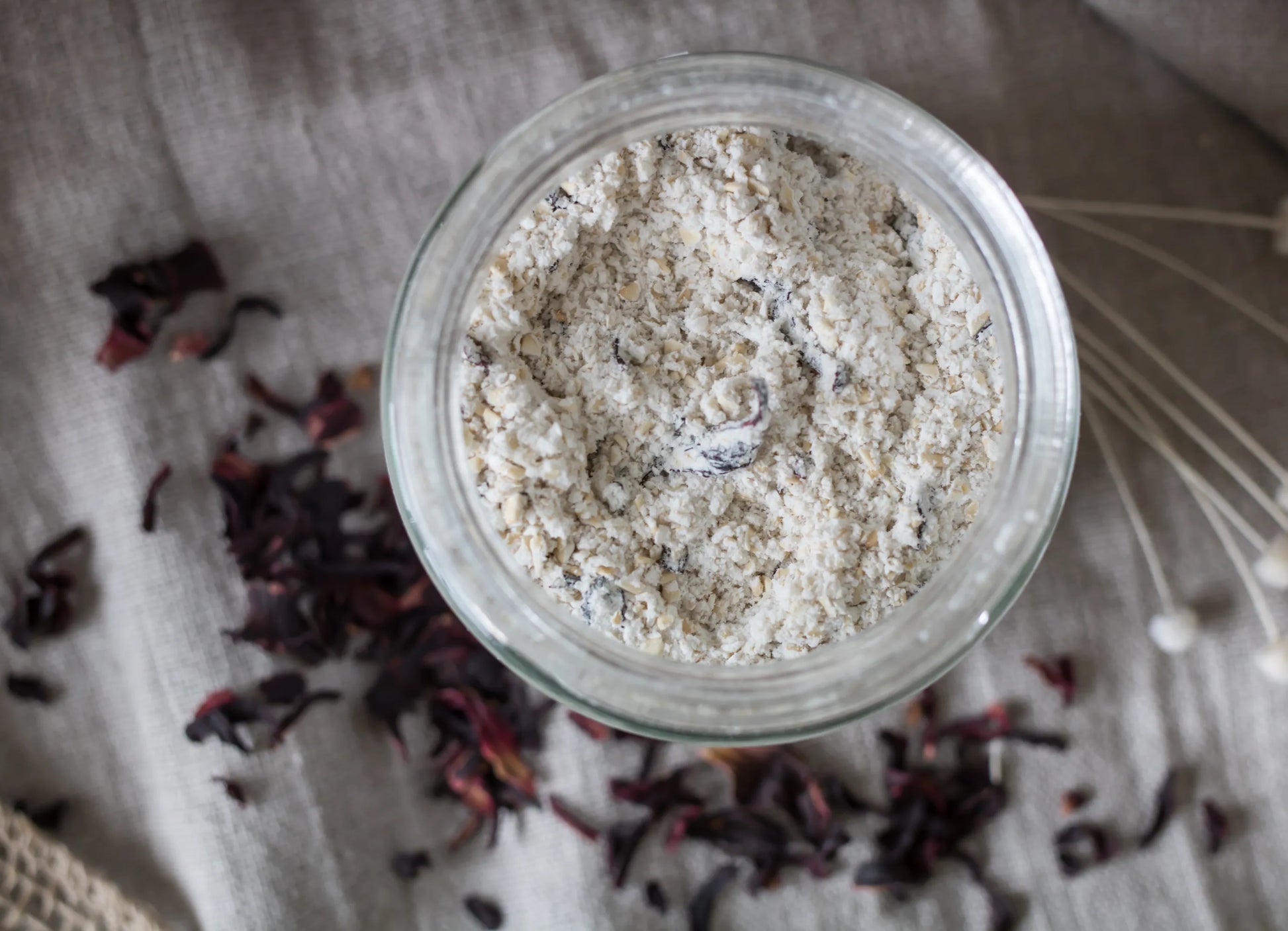 Avena sativa kernel (oats)*, sodium bicarbonate, hibiscus sabdariffa flower*, cananga odorata flower oil*.